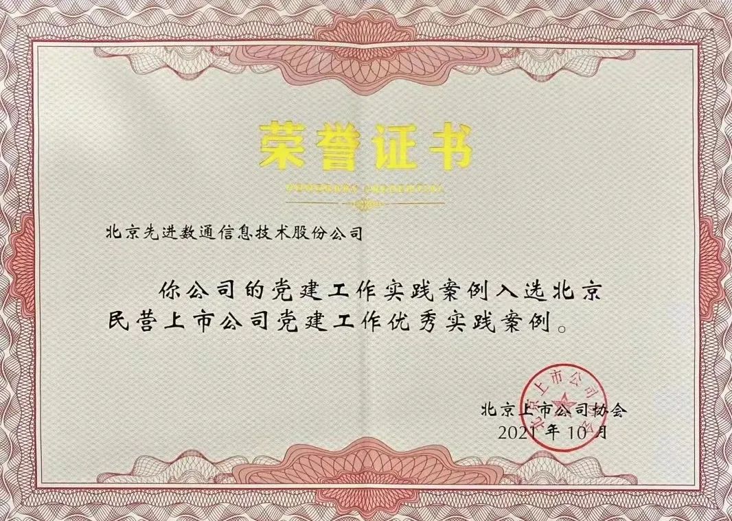 近期,北京上市公司协会授予北京威九国际V9信息技术股份公司荣誉证书,威九国际V9党建工作实践入选北京民营上市公司党建工作优秀实践案例,相关党建活动已收录在《北京民营上市公司党建工作优秀实践案例汇编》。